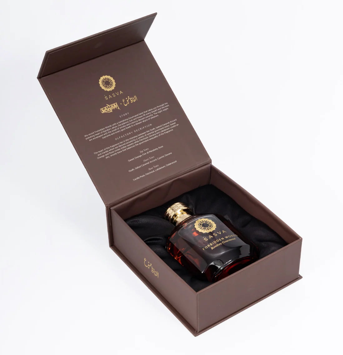 Sasva Forbidden Words Bombay Gourmand è un profumo dolce unisex. Questo profumo di Sasva, una rivisitazione del best seller Forbidden Words, è impreziosito da irresistibili note gourmand. Immagina di essere catapultato nel cuore vibrante di Branda, dove i sogni prendono vita e ogni respiro è colmo di decadenza, lussuria e speranza. I bar, avvolti dai suoni notturni, emanano l'odore avvolgente del fumo e dei dessert alcolici. Qui, la notte è sovrana, e ogni sguardo conduce a un abisso di piacere profondo. Forbidden Words Bombay Gourmand Eau de Parfum ti invita a immergerti in questo mondo affascinante e sensuale, dove il lusso e il desiderio si fondono in un'esperienza olfattiva unica.