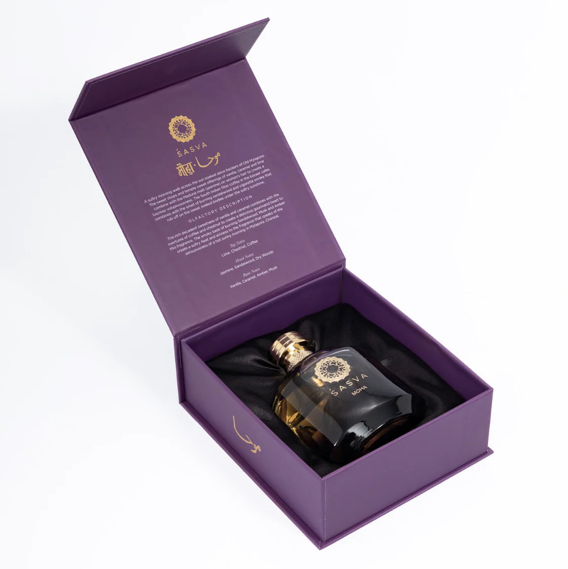 Moha è un profumo speziato unisex. In una calda mattina di sole a Mylapore, vecchi bazar di spezie invitano a una passeggiata afosa. L'aria è impregnata di dolci aromi provenienti dai negozi e dai templi, dove la vaniglia, il caramello e il lime si mescolano con il profumo del gelsomino. Moha Eau de Parfum cattura l'essenza di questa esperienza unica: il caffè filtrato dell'India del Sud si mescola con il sentore di sandalo bruciato e il fumo delle sigarette, avvolgendo i corpi al sole. Nel cuore di questa fragranza, la ricchezza e la decadente dolcezza della vaniglia e del caramello si fondono con l'intenso aroma del caffè e delle castagne, creando un delizioso bouquet gourmand. Infine, una base fumosa di legno di sandalo bruciato, muschio e ambra avvolge tutto, evocando il calore afoso e l'atmosfera sensuale di una mattina di sole a Mylapore.