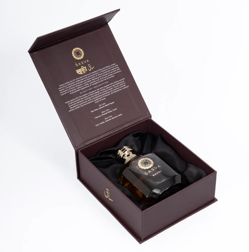 Saaqi invita a entrare nelle osterie dell'India e della Persia medievali, dove mercanti e poeti celebravano l'amore e l'ispirazione. Omaggio al portatore di vino Sufi, questo profumo incarna l'ebbrezza della connessione divina ispirata alla poetica di Rumi, Khayyam e Hafez. Saaqi si apre con la ricchezza del vino rosso, stratificato con la crema di mandorle e i toni speziati del pepe nero. Il tabacco fumoso e il legno di cedro dominano il cuore, evocando la foschia di un'antica taverna. Il fondo è gourmand, con l'oud che si fonde con la vaniglia e la dolcezza balsamica del benzoino, il tutto ammorbidito da un tocco di muschio.