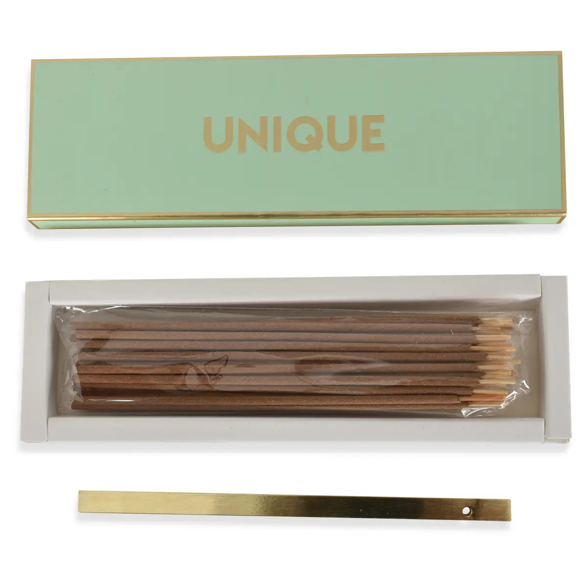 Un cofanetto con 30 bastoncini di incenso tradizionale, accompagnato da un elegante portaincenso dorato, semplice e raffinato. Sulla scatola un messaggio positivo arricchisce l’esperienza, aggiungendo un tocco di armonia all’atmosfera rilassante creata dal profumo.